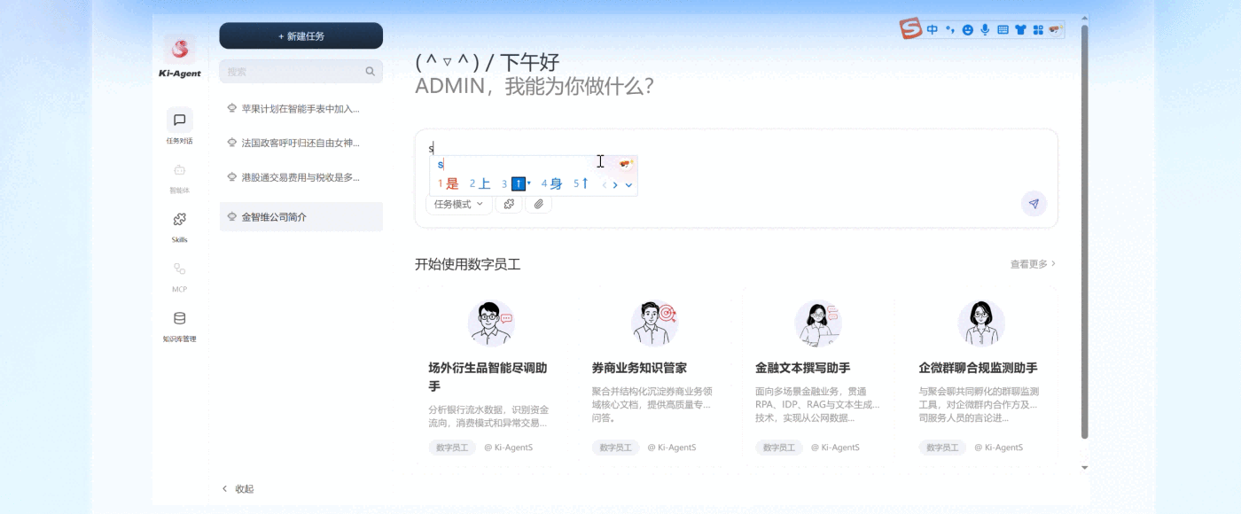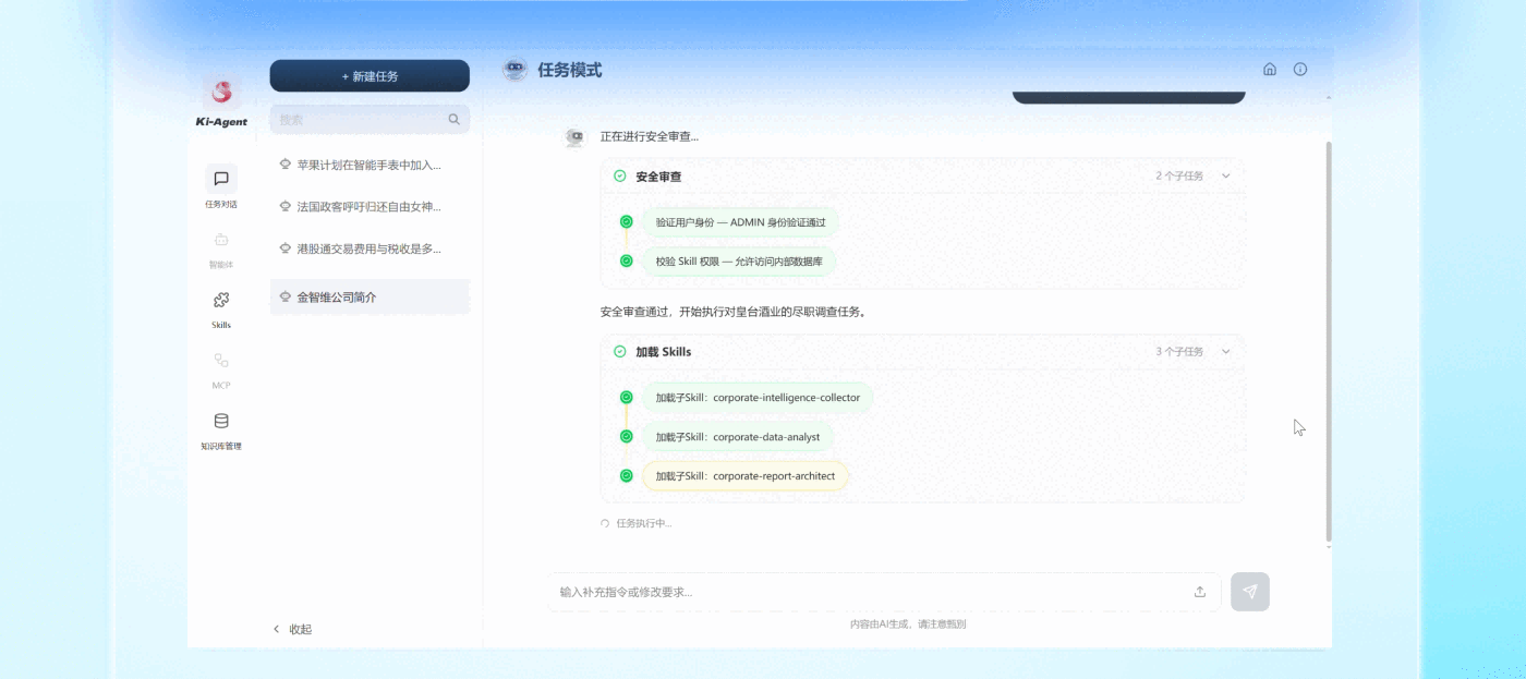 与追求“快、全、爽”的个人助手不同,Ki-Agents从第一天就致力于实现企业级智能体的“准确、安全、可控”。产品不追逐热度本身,而是坚持把业界最新能力以最快、最安全、最务实的方式落地到可收益场景。特别是在金融等高风险行业,把治理能力内嵌到底层,而非事后补救,为企业提供真正可规模化落地的智能体底座。