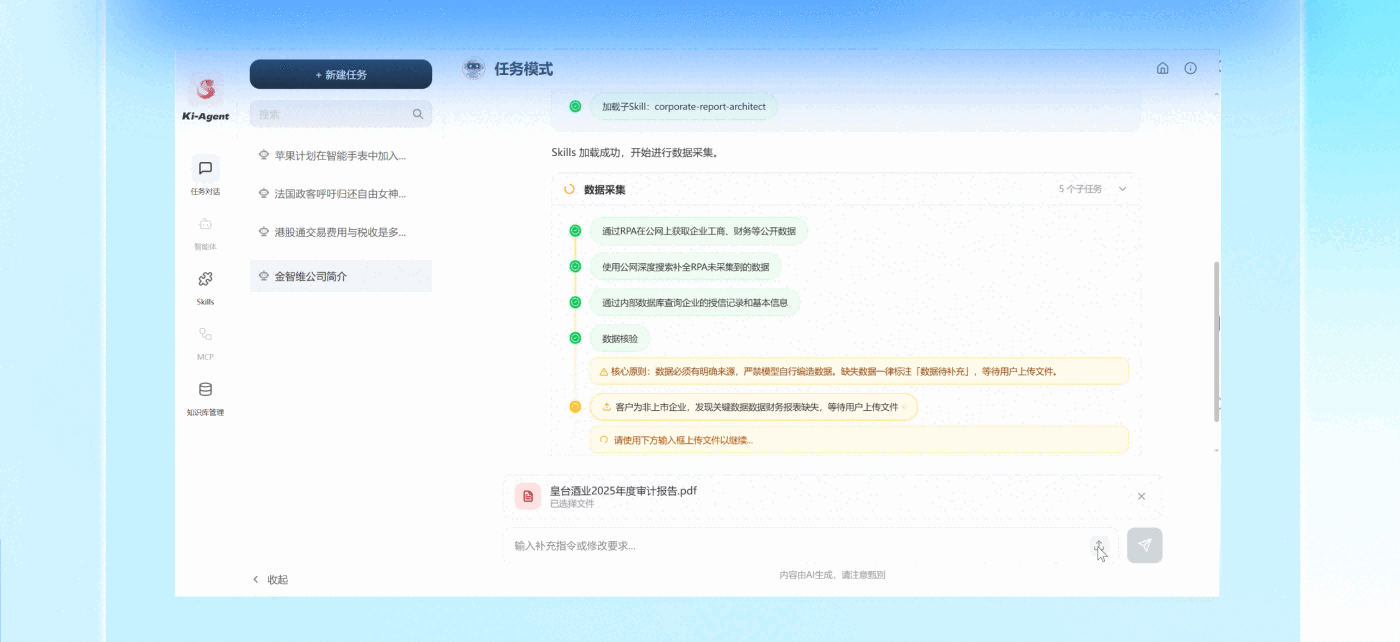 • 自动执行深度业务场景,多Skills智能协同,完成数据采集、分析到报告生成全流程